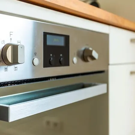 The 80 m² apartment includes a balcony and a fully equipped kitchen with a washing machine for utmost comfort.